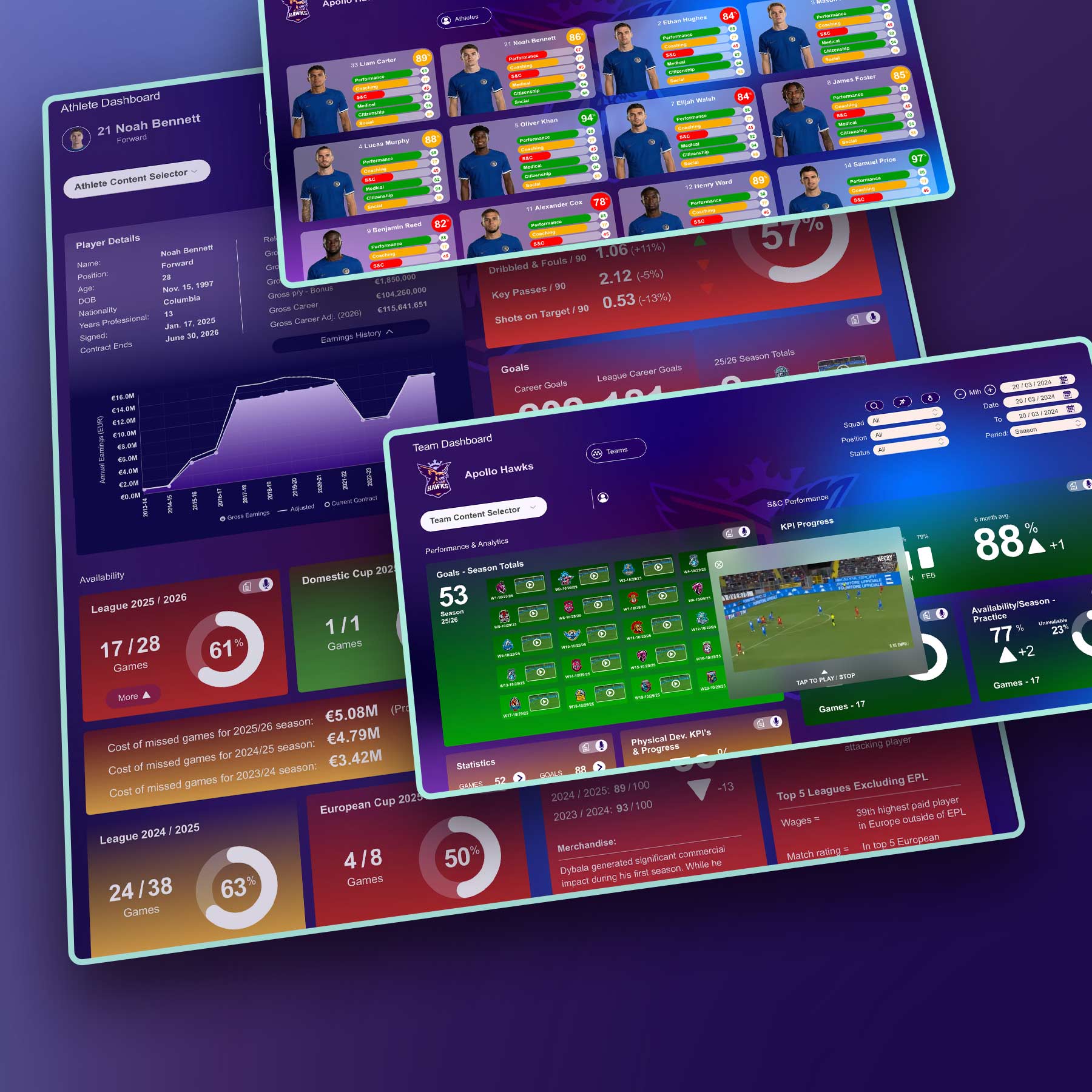 Apollo’s Athlete Management System provides coaches and players with actionable insights through comprehensive performance, health, and game data analytics. By streamlining data collection, visualization, and reporting, Apollo helps teams optimize player development, reduce injury risks, and gain a competitive edge. With Apollo, coaches can make smarter, data-driven decisions that lead to more wins.